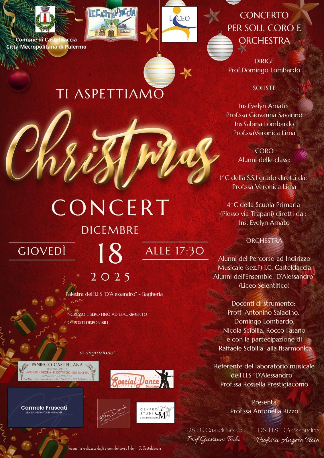 Si comunica che giorno 18 dicembre 2024 alle ore 17.30, presso la palestra dell’I.I.S “D’Alessandro” di Bagheria, si terrà il Concerto di Natale dell’Orchestra del nostro Istituto in collaborazione con l’Ensamble “D’Alessandro” appartenente all’Istituto ospitante.